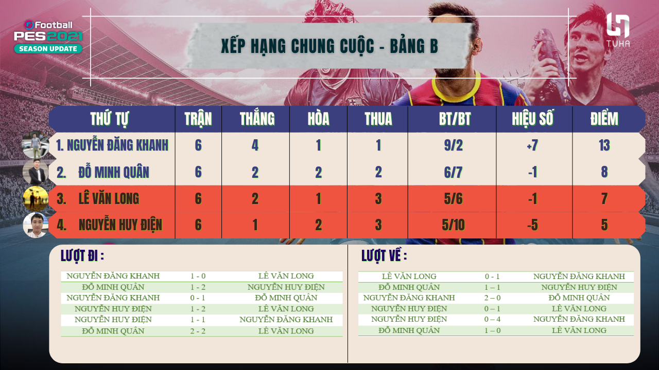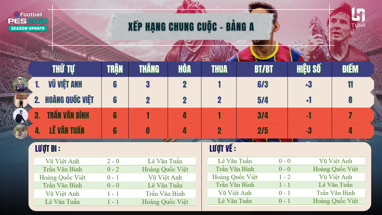 Sau 6 lượt thi đấu, 2 Player đứng đầu mỗi bảng sẽ lọt vào vòng thi đấu bán kết.